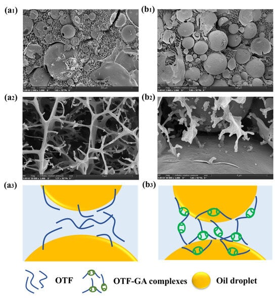 The micromorphology of the emulsions was further observed by CryoSEM, which was helpful for exploring the stabilization mechanism of the emulsions. Due to the removal of water from the sample during the sublimation process prior to CryoSEM observation, only solid particles and oil phases were present in the image. Figure 3(a1,a2) shows CryoSEM images of OTF-stabilized OPE, and Figure 3(b1), as well as Figure 3(b2), shows CryoSEM images of OTF—GA complexes-stabilized OGPE. As can be seen from Figure 3, there was network structure between the droplets of both emulsions, which was due to the presence of OTF in both emulsions. At the interface of OGPE, the OTF—GA complexes formed by the combination of OTF and GA, with a spherical particle structure, was adsorbed on the droplet surface for stabilizing the emulsion [34]. The stabilization mechanism of the two emulsions is shown in Figure 3(a3,b3). Firstly, the independent oil and water phases were quickly blended under the action of external mechanical forces, forming smaller oil droplets. Then, the protein fibrils were anchored and adsorbed on the surface of the droplets, forming a hard mechanical barrier on the oil–water interface. Finally, the fibrils matrix adsorbed on the surface of the droplets or aggregated in continuous phases bridge with each other to build a stable network structure [35].