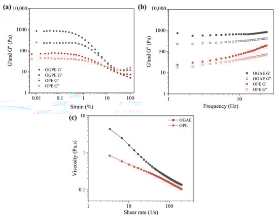 Strain sweep (a), frequency sweep (b), and viscosity (c) of OPE and OGPE.
