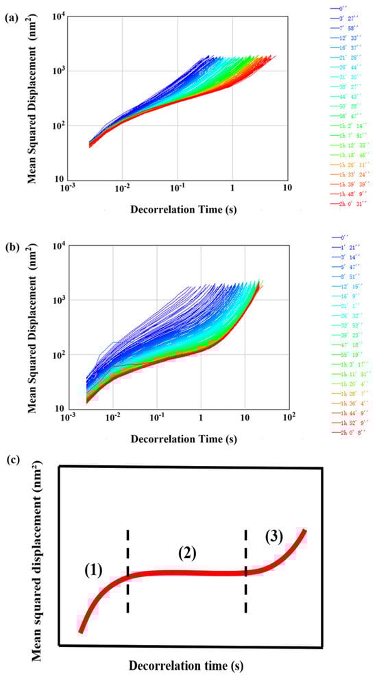 Compared with traditional rheology, microrheology can monitor the viscoelastic and other microrheological properties of samples, without interference or destructiveness [38]. The changes of mean square displacement (MSD) of the two emulsions with decorrelation time were obtained by using a Rheolaser Master optical microrheometer. The particle MSD curve increased linearly with time in a completely viscous fluid. In contrast, the MSD of the particles in a viscoelastic fluid was limited, and the particles were stuck in a network structure, establishing a plateau region [39]. Based on the particle motion trajectories at different decorrelation times, they can be divided into three main behaviors (Figure 5c): (1) At the beginning of the decorrelation time, the particles, which were only affected by solvent viscosity, moved freely inside the cage. The increase in MSD was linearly related to the decorrelation time. (2) At the middle of the decorrelation time, the particle motion was affected by the interactions of the cage structure, resulting in a slower the movement and reaching the plateau region. (3) At the end of the decorrelation time, the particle motion was no longer affected by the cage, and the MSD slope increased linearly with the decorrelation time curve [40]. As shown in Figure 5a,b, both the OTF-stabilized OPE and the OTF—GA complexes–stabilized OGPE clearly showed a plateau in the MSD curves, which may be due to the limited movement of the droplets in the emulsions, forming a denser viscoelastic structure [40]. Compared with OPE, OGPE exhibited a larger de-correlation time scale, indicating that OGPE exhibited higher viscoelasticity.