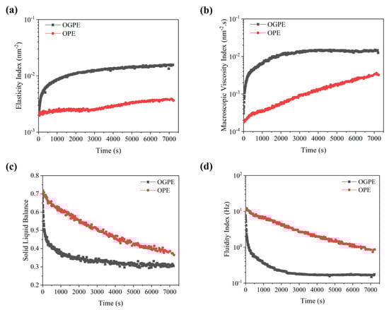 Elasticity index (a), macroscopic viscosity index (b), solid–liquid balance (c), and fluidity index (d) of OPE and OGPE.