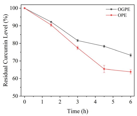 The delivery system represented by emulsion technology can provide excellent protection effects for curcumin under UV radiation. Figure 7 shows curcumin residue levels in OPE and OGPE after exposure to UV light. It can be seen from the figure that after UV treatment, the curcumin residue levels in both emulsions decreased, and the degradation rate of curcumin in OGPE was slower than that of the OPE, which suggested that OGPE could delay the dissolution of curcumin. This could be attributed to the following explanation. In OGPE, OTF—GA complexes composed of OTF and GA were wrapped around the oil droplet through complexation, which could improve the mechanical strength of the adsorption layer at the oil–water interface of the emulsion, as well as increase the thickness and density of the interface protective layer. This helped to provide a stronger physical barrier for curcumin in the oil phase and to delay the degradation of curcumin under UV light, thereby resulting in higher curcumin residue levels [35,43]. In addition, the higher viscosity of OGPE compared to that of OPE was also instrumental in protecting curcumin. The high viscosity led the emulsion droplets to accumulate closer together, limiting mobility and reducing the exposure of curcumin to UV light, resulting in higher curcumin residue levels in OGPE. This result was consistent with the previous report stating that molecular size, size distribution, and texture characteristics of polymer particles were important factors affecting the UV shielding ability of Pickering emulsions [44].