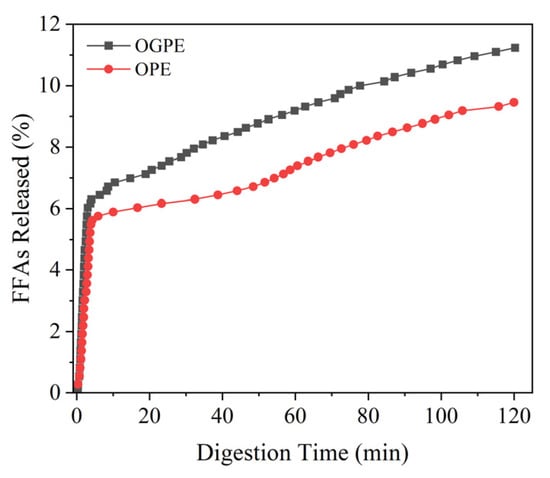The lipolysis degree of the two emulsions is shown in Figure 8. After simulated intestinal digestion, OGPE released more free fatty acids (FFAs) than did OPE, indicating that OGPE stabilized by OTF—GA complexes had a higher lipolysis degree. The above phenomenon could be elucidated by the following reasons. Firstly, the stability of the OTF—GA complexes was affected by the surrounding environment. In the simulated gastric fluid, the low acid environment inhibited the carboxyl dissociation of GA and weakened the electrostatic interaction between GA and OTF, which resulted in the expansion of the OTF—GA complexes and exposed the wrapped oil phase, thus facilitating the contact between lipase and the oil phase. Secondly, the pH environment of simulated intestinal fluid was not conducive to the binding between GA and OTF, which further damaged the structure of the OTF—GA complexes and promoted the full contact between the oil phase and lipase to generate FFAs [45].