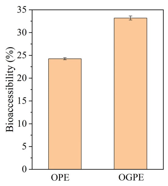 Figure 9 depicts the bioaccessibility of curcumin in OPE and OGPE after simulated digestion in vitro. As can be seen from the figure, the bioaccessibility of curcumin in OGPE was higher than that in OPE. Curcumin is not soluble in aqueous gastrointestinal fluids due to its poor water solubility. In order for curcumin to be absorbed through the GI tract, it must first be dissolved in the mixed micelle [46]. The generation of mixed micelles occurs due to the lipolysis of the emulsion. More FFAs were released by OGPE during lipolysis to generate more mixed micelles, which resulted in the better solubilization of curcumin, thereby improving the bioaccessibility of hydrophobic curcumin. In addition, the bioaccessibility of curcumin was closely related to the average droplet size of the emulsions. A smaller average droplet size corresponded to a larger specific surface area, which would result in more curcumin being exposed to a stringent external environment. Moreover, compared to OTF, OTF—GA complexes could form a hard interface layer to delay the degradation of curcumin and protect it from external oxidative stimulation [47].