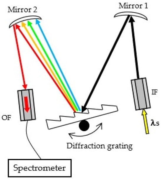 For the experiment, a Czerny–Turner monochromator with a diffraction grating was assembled, which is presented schematically in Figure 1. No special slits were used at either the input or the output of the monochromator. Optical fibers with 105 μm core diameters were placed at the entrance and at the exit of the monochromator, the cores of which serve as slits. The input optical fiber (IF) and the output optical fiber (OF) were mounted in zirconia ferrules and were polished with an optical fiber polishing machine (FibrMet, Buehler Ltd., Lake Bluff, IL, USA) using diamond polishing papers with a decreasing grain size, namely, 30 μm, 9 μm, 3 μm, and 1 μm. The prepared fibers were mounted in fiber ferrule clamps (Thorlabs Inc., New Jersey, NY, USA).