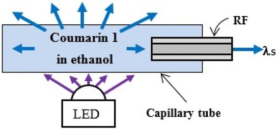 In the scheme in Figure 3, the active medium was illuminated directly by the LED. The fluorescence solution was placed in a capillary tube with a RF was placed inside to receive the fluorescence λS and the tube was placed directly on the LED lens. The capillary tube was made of borosilicate glass with an inner diameter of approximately 343 μm and a wall thickness of approximately 64 μm. The tube was manually drawn from a larger-diameter tube using a butane gas torch as a heating source.
