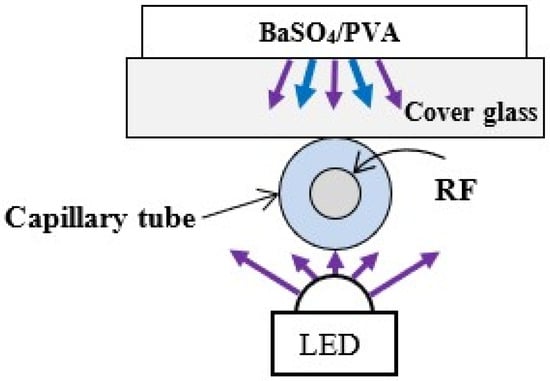 To demonstrate the possibility of increasing the LED excitation as well as accepting the fluorescence received by the fiber, we used a diffuse reflective layer composed of BaSO4 dissolved in PVA [47,48] applied to a cover glass. The PVA was dissolved in distilled water at 90 °C and stirred manually until a homogeneous solution was obtained. Then, the BaSO4 powder was added, after which the mixture was stirred manually until thickened. The solution was dropped onto a cover glass, which was left on a hot plate at 30 °C until the water evaporated and a solid layer was formed. The prepared diffuse reflector was placed on the capillary tube, as shown in Figure 4.