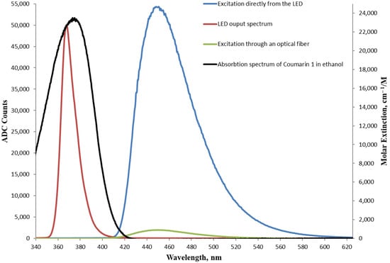 Figure 5 shows the obtained fluorescence spectra of Coumarin 1, excited, respectively, through an optical-fiber-coupled LED and direct excitation by an LED. The corresponding excitation set-up schemes are presented in Figure 2 and Figure 3, respectively. The spectra were obtained at the spectrometer’s minimum integration time of 5.22 ms. Also, the figure shows the output spectrum of the LED at 367 nm obtained through an EF, with the EF and spectrometer fiber spaced apart to prevent detector saturation, which occurs at 65130 ADC counts.