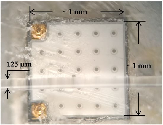 Figure 6 shows the die emitter of the same LED type and with the lens removed, as well as an optical fiber placed on top with a cladding diameter of 125 μm for comparison. The picture was taken through an optical microscope (Olympus, Tokyo, Japan), and the dimensions of the LED emitting surface were determined to be approximately 1 mm × 1 mm. This means that a significant part of the output radiation of the LED was not accepted by the optical fiber; therefore, the intensity of the excitation radiation from the fiber was too low and insufficient to cause significant fluorescence. For this reason, we resorted to the scheme of Figure 3, where the receiving fiber, together with the capillary tube, were positioned in such a way as to obtain a maximally intense fluorescent signal.