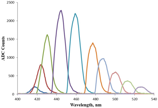 Due to the high divergence of the excitation radiation from the LED and the capture of only part of the fluorescent signal, which was emitted in all directions, the efficiency of the whole process was lowered. In an attempt to increase the useful fluorescent signal, the LED was driven with a forward current ranging from 90 mA to its typical working value of 150 mA with a 10 mA increment. The resulting spectra after the monochromator are presented in Figure 9, where an increase in the peak value of the output intensity is observed with uniform steps corresponding to the driving current of the LED.