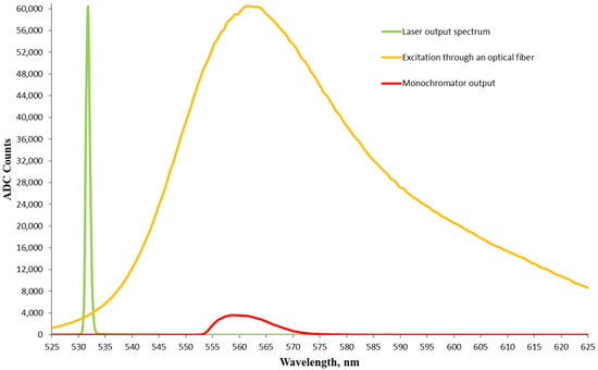 The spectra from the laser source and the fluorescence before the monochromator were at slightly spaced connectors to keep the maximum intensities below the saturation level. It can be seen that the radiation intensities after the monochromator with laser excitation through an optical fiber and with direct LED excitation were similar, despite the higher optical power of the LED. This is primarily due to the smaller emitter area of the laser, resulting in a higher radiation density, and easier coupling to the optical fiber.