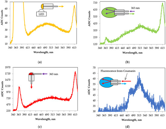 In the case of Figure 10d, longitudinal excitation from an optical-fiber-coupled LED was used again, but this time, the excitation radiation was the fluorescence spectrum of Coumarin 1 induced by using the scheme of Figure 4. The peak at 515 nm in Figure 10d and also that in Figure 10b are associated with the presence of vitamin E. The peak at 480 nm and the weak peak around 445 nm in Figure 10d are associated with the presence of oxidative products [53,54,55,56]. The obtained spectrum at an integration time of 1 s was rather weakly intense. For this reason, we did not try excitation with radiation from the monochromator because we were unable to detect the more intense fluorescence from EVOO after 626 nm, which is commonly reported in the literature [52].
