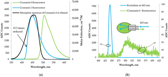 In Figure 11b, the obtained spectrum from Coumarin 6 is shown with longitudinal excitation through an optical fiber with radiation from the monochromator at 443 nm. The excitation spectrum falls entirely into the absorption spectrum of Coumarin 6, close to its maximum at 457 nm [57]. In the same figure, the inset shows the scheme used to capture the fluorescence of Coumarin 6. The obtained spectra show that the signal was detectable, thereby demonstrating the ability to detect a specific fluorophore. However, the fluorescence obtained was quite weak as it was observed for an integration time of 1 s. This requires further improvements to be made to the LED-induced fluorescence scheme to increase the intensity of the output radiation from the monochromator.