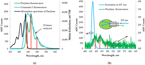 Figure 12a shows the spectrum of Perylene obtained under longitudinal excitation through an optical fiber with fluorescence from Coumarin 1, which partially overlaps the absorption spectrum of Perylene [58]. The resulting fluorescence signal was clearly pronounced despite the slight overlap between the absorption and excitation spectra. We believe that this is because of the sufficiently intense excitation fluorescence radiation. In Figure 12a, the red lines mark the three characteristic Perylene fluorescence peaks, respectively, at 445.5 nm, 466 nm, and 500 nm.