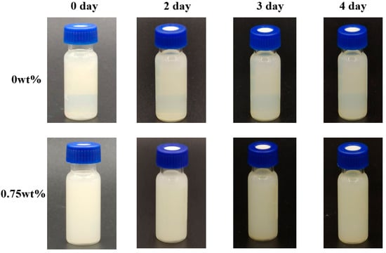 As is shown in Figure 1, from day 0 to day 4, the appearance of composite colloidal particle dispersion and Pickering emulsion remained stable and uniform without any demulsification or delamination. The appearance of the Pickering emulsion group with CEO (0.75 wt%) was milky, and the composite colloidal particle dispersion without CEO (0 wt%) was clearer and more transparent. The reasons might be as follows. After the addition of CEO, the interfacial tension of oil-water interface in the emulsion was reduced, so that the oil phase was dispersed into the water phase to form a milky white stable liquid [20].