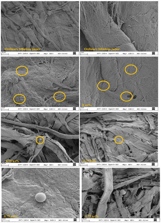 SEM images of ordinary bibulous paper, bibulous paper soaked in composite colloidal particle dispersion (0 wt%), and Pickering emulsion fresh-keeping paper (0.75 wt%). The yellow circles’ role is to highlight the density and distribution of particles.