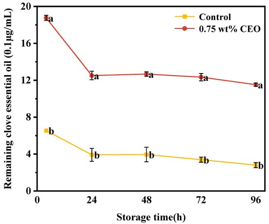 During a 96 h storage period at 25 °C, retention of essential oil in anhydrous ethanol group (Control) and CEO Pickering emulsion fresh-keeping paper (0.75 wt%). Different superscript letters (a, b) represent statistically significant differences (p < 0.05).