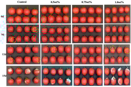 Cherry tomatoes (Solanum lycopersicum var. cerasiforme), an annual herb, belong to the tomato genus of the Solanaceae family. Their fruits are rich in nutrients such as carotenoids, ascorbic acid, total phenols and flavonoid [1], having the functions of moisturizing, quenching thirst, strengthening the stomach and increasing appetite. However, as a climacteric fruit, harvested cherry tomatoes will undergo sensory quality deterioration and decay during storage [2], leading to a decrease in nutritional value and commodity value. Therefore, it is really important to preserve cherry tomatoes fresh after harvest. Traditional methods such as chemical preservatives may maintain fruit and vegetable freshness. Although chemical preservatives can achieve the effect of preservation, they may produce pesticide residues [3,4], affecting the health of consumers. The use of plastic cling film preservation is also a common method of preservation. Plastic cling film has the advantages of high strength and convenient use. However, degrading plastic products is usually difficult and there is the problem of environmental pollution. Hence, it is necessary to develop novel methods and materials to extend the shelf life of postharvest fruits such as cherry tomatoes and reduce the risks of food safety [5].