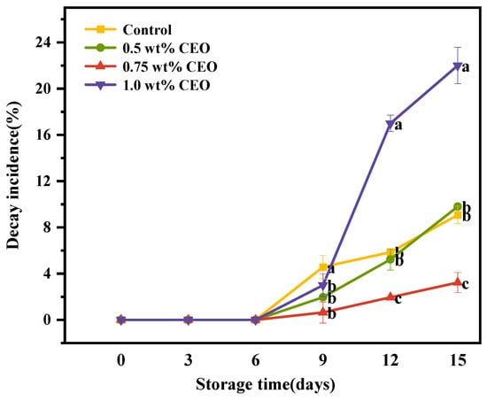 According to Figure 8, the effects of 0.75 wt% CEO group on color differences were obviously better than those of control group (p < 0.05) in the later stages of storage. Results on the 12th day showed that the color difference of 0.75 wt% CEO group was only 73% of that of control group. The skin color of the cherry tomato is closely related to the oxidative degree of internal nutrient substances, such as carotenoids and xanthophylls [27]. Because the fresh-keeping paper had a strong antioxidant effect, the content of nutrients was relatively stable and ΔE was lower.