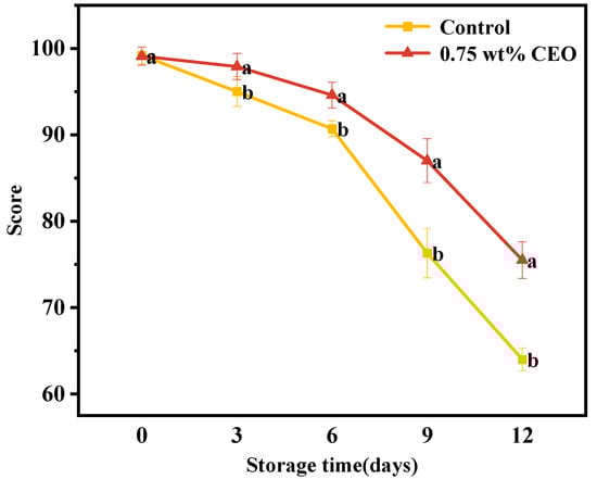 During a 12-day storage period at 25 °C, the effect of CEO Pickering emulsion fresh-keeping paper on sensory evaluation scores of cherry tomatoes. Different superscript letters (a, b) represent statistically significant differences (p < 0.05).