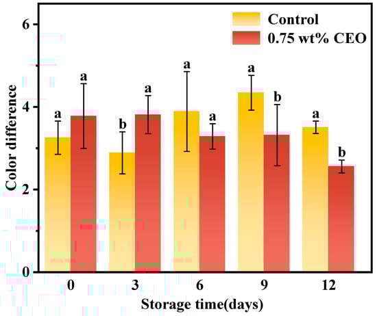 During a 12-day storage period at 25 °C, the effect of CEO Pickering emulsion fresh-keeping paper on color difference of cherry tomatoes. Different superscript letters (a, b) represent statistically significant differences (p < 0.05).
