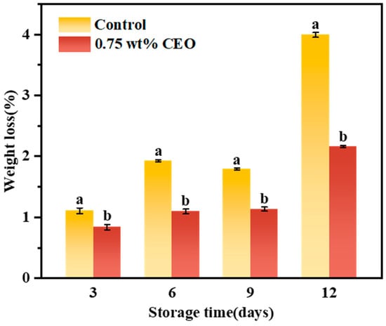 During a 12-day storage period at 25 °C, the effect of CEO Pickering emulsion fresh-keeping paper on weight loss of cherry tomatoes. Different superscript letters (a, b) represent statistically significant differences (p < 0.05).