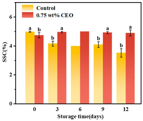 During a 12-day storage period at 25 °C, the effect of CEO Pickering emulsion fresh-keeping paper on soluble solid concentration (SSC) of cherry tomatoes. Different superscript letters (a, b) represent statistically significant differences (p < 0.05).