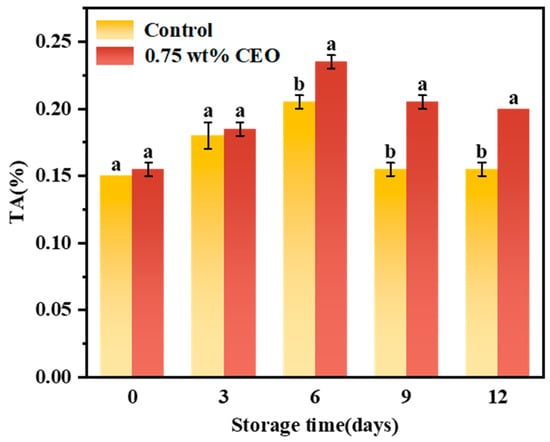 During a 12-day storage period at 25 °C, the effect of CEO Pickering emulsion fresh-keeping paper on titratable acid (TA) of cherry tomatoes. Different superscript letters (a, b) represent statistically significant differences (p < 0.05).