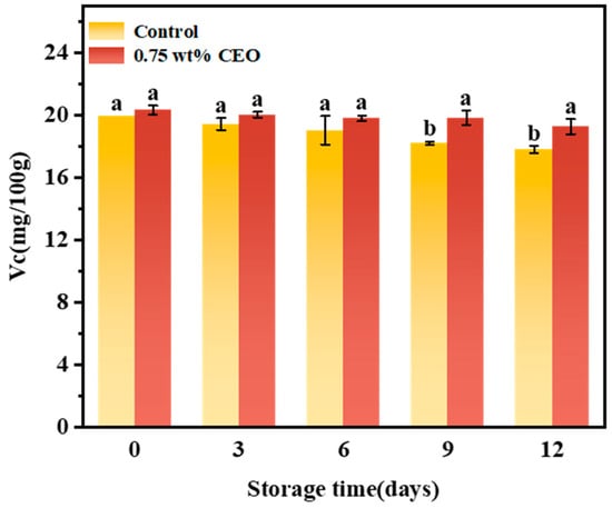 During a 12-day storage period at 25 °C, effect of CEO Pickering emulsion fresh-keeping paper on vitamin C (Vc) of cherry tomatoes. Different superscript letters (a, b) represent statistically significant differences (p < 0.05).