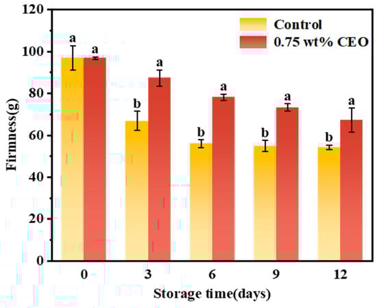 During a 12-day storage period at 25 °C, effect of CEO Pickering emulsion fresh-keeping paper on the hardness of cherry tomato. Different superscript letters (a, b) represent statistically significant differences (p < 0.05).