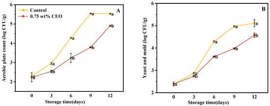 During a 12-day storage period at 25 °C, inhibition of CEO Pickering emulsion fresh-keeping paper on bacteria (A), mold and yeast (B). Different superscript letters (a, b) represent statistically significant differences (p < 0.05).
