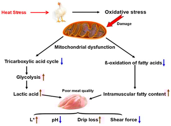 Figure 1 presents the relation between heat stress and the quality of breast muscle broilers. Chronic heat exposure can induce oxidative stress, irreversibly damaging the mitochondria, which are prone to oxidative damage as a result of the high content of phospholipids and proteins in their membranes. CHS also significantly changes the mitochondrial morphology [34] and structure [35]. Mitochondrial dysfunction leads to a decline in the mitochondrial oxidation of energy substrates, such as lipids and carbohydrates, resulting in metabolic changes that affect the meat quality by decreasing the pH45min and shear force (SF) and increasing the L* value and drip loss.