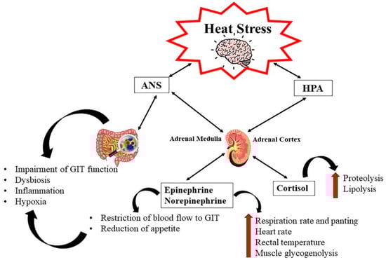 Gonzalez-Rivas et al. [15] explained the stress responses to high ambient temperatures and humidity (Figure 2). These responses primarily involve autonomic reactions through activating the autonomic nervous system (ANS) mediated by catecholamines (adrenaline/epinephrine and noradrenaline/norepinephrine). They include increases in the respiration rate and heart rate, panting, elevated body temperature, redistribution of blood flow from the viscera to the skin for thermoregulation, and promotion of energy utilization from body reserves. This process accelerates muscle glycogenolysis and suppresses energy storage. The authors also reported that AHS and CHS also increase the plasma glucocorticoid concentrations (cortisol) via activation of the hypothalamic–pituitary–adrenal (HPA) axis, which improves heat loss (via vasodilation, increased proteolysis, and changes in lipid metabolism).