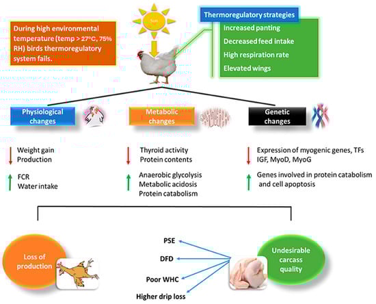 According to Nawaz et al. [5], high temperatures (exceeding the TNZ, the appropriate temperature for broilers is between 18 and 22 °C [51]) during poultry production phases generate physiological, metabolic, and genetic changes in birds due to HS and harm breeding efficiency and meat quality (Figure 3). Maintaining homeostasis in bird-rearing conditions should be a primary goal, but it is not—that goal is high commercial poultry production. When the temperature rises, the birds maintain homeostasis and need more energy to maintain their body temperature. As previously mentioned, birds do not have sweat glands, and their skin is covered with feathers, so to cope with the heat, birds increase their number of breaths, pant, and raise their wings. However, unable to ensure proper thermoregulation, birds succumb to hyperthermia, which ultimately translates to a loss of production and poorer-quality meat.