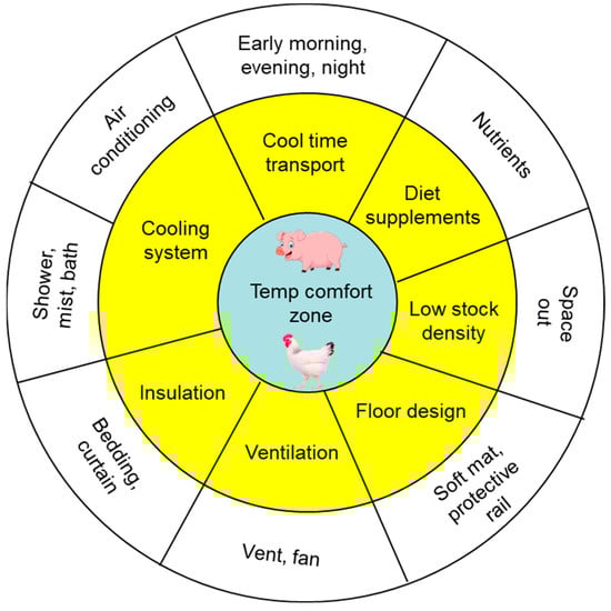Various methods are used to mitigate the consequences of HS in terms of pig and poultry production and meat quality. These include altering the animal’s microenvironment to increase the exchange of heat between the animal and its surroundings (cooling options) or feeding management (changes in diet composition and distribution), genetic selection for thermal tolerance [8], and in the case of animal and poultry transport, conducting transportation at night or reducing the transport time [20].