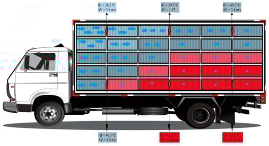 However, using environmentally controlled sheds and modern ventilation systems is a short-term solution because it costs too much for farmers to implement [5]. Therefore, Spurio et al. [14] (Brazil—tropical and subtropical regions, temperature 28.7 ± 2.6 °C, and relative humidity 53.8 ± 9%) found a low-cost solution for improving animal welfare conditions and meat quality. They designed [14] truck containers that allowed for a reduction in the occurrence of PSE meat by 66.3% and 49.6% with and without wetting, respectively. In another study, Carvalho et al. [67] evaluated the effect on turkey welfare in the HS conditions of routine practices in truck transportation. They focused on the heat distribution in trucks (Figure 5). They found a thermal core formed in the middle and rear of the truck container regions; the heat was produced by the birds and the birds in these regions were more prone to a higher incidence of dead-on-arrival (DOA) index and PSE-like meat occurrence. A water-shower treatment applied to the birds at the farm and adequate ventilation throughout the vehicle due to a better truck container design are challenges to improving animal welfare and reducing the mortality and PSE meat incidence.