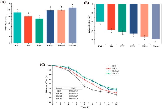 Effects of sodium alginate and curcumin on film-forming solution properties: (A) particle size, (B) ζ-potential, and (C) retention during 16 h of heat treatment and encapsulation efficiency (EE) of curcumin. Different letters (a–e) indicate significant differences (p < 0.05).