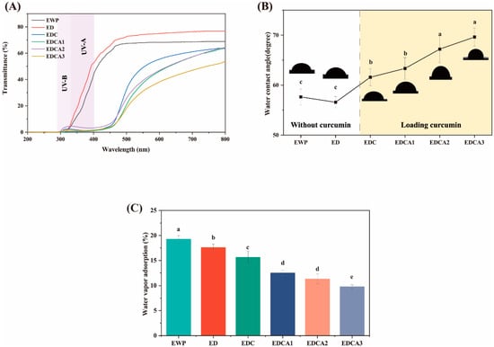Optical properties are crucial for determining the applicability of edible films in food packaging systems, as these properties affect the appearance of the packaged product and consumer acceptance. In Table 3, it is shown that the sole pH-driven process had almost no effect on the visible light transmission of the EWP films, suggesting that the pH-driven method primarily affects the microphase structure rather than the optical properties of films. The incorporation of curcumin and Alg significantly increased the opacity of the films, which was attributed to the covalent bonding between EWP and Alg, increasing the density of the film. A reduction in transparency is a disadvantage for food packaging that requires direct observation of the food state. This issue can be overcome in future research by improving the preparation method, reducing the thickness, or altering the proportions of additives. As shown in Figure 2A, films incorporating curcumin effectively absorbed UV-A radiation, which was mainly due to the diketone groups contained within curcumin loaded in the films [48]. This is consistent with Roy’s observation that the reduced light transmission of the composite film is mainly due to curcumin [49]. This was probably due to the ultraviolet absorption of the phenolic group of curcumin (1,7-bis-(4-hydroxy-3-methoxyphenyl)-1,6-heptadiene-3,5-dione). Compared with those of EDC, the films with added Alg absorbed more in the UV region, indicating stronger UV-blocking capabilities. This is similar to the phenomenon observed by Shahana Bishnoi et al. [29], who prepared films by combining sodium alginate with wheat proteins and found that the composite films absorbed more in the UV region and hence had lower transmittance as measured, indicating UV-blocking behavior. The blending of Alg with EWP resulted in the formation of a dense structure, which increased the EE of curcumin, thereby enhancing the blocking performance of the film in the UV-A region. All the films exhibited excellent UV-B blocking capabilities because of the spontaneous UV-B blocking ability of aromatic amino acids in EWP [50].