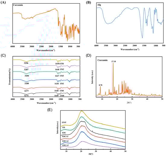 The crystallinity of a substance can be determined from its XRD pattern. Substances with sharp peaks are considered crystalline, while those without distinct peaks are considered amorphous. As shown in Figure 3D,E, the XRD pattern of curcumin showed multiple narrow and sharp crystalline peaks indicating its crystalline structure. On the contrary, all the films showed significant broad diffraction peaks centered at 2θ = 20°, indicating that the films are predominantly amorphous in nature. Notably, even in the curcumin-containing films, the sharp diffraction peaks of the curcumin crystals were almost undetectable, suggesting the successful encapsulation of curcumin in the film matrix using the pH-driven method [61]. Furthermore, with the blending of Alg, the diffraction peaks of curcumin crystals disappeared completely, and the intensity of the peaks decreased at 2θ = 20°. This can be attributed to the cross-linking between proteins and polysaccharides, which not only limits the thermal precipitation of curcumin, but also enhances the molecular mobility of the protein polymer chains and disrupts the alignment of protein molecules [62]. Additionally, a comparison of XRD patterns for films with varying concentrations of Alg revealed no significant differences. All films exhibited similar peak shapes, lacking any additional strong peaks. This suggests good compatibility between the highly concentrated and tightly bound Alg and EWP within the film matrix.