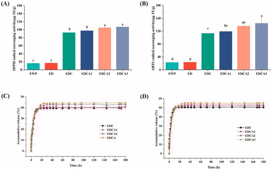 Antioxidant capacity of the films: free radical scavenging activities of (A) DPPH and (B) ABTS; curcumin release profiles in (C) semi-fat simulants and (D) fat simulants. Different letters (a–d) indicate significant differences (p < 0.05).