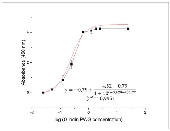Dose response curve obtained from the analysis of the gliadin-PWG standard (0.025–25 µg/mL) by sandwich ELISA using Fab-C as detection antibody and Fab8E-4 as capture antibody. This model (red line) was used to estimate the gluten content of the tested commercial food products. An HRP-conjugated anti-human Fab was used as the secondary antibody. Mean values of three independent determinations (black squares) and standard deviation of each data set are shown. The reduced chi-square obtained from Origin 8.0 software was χ2 = 1.254.