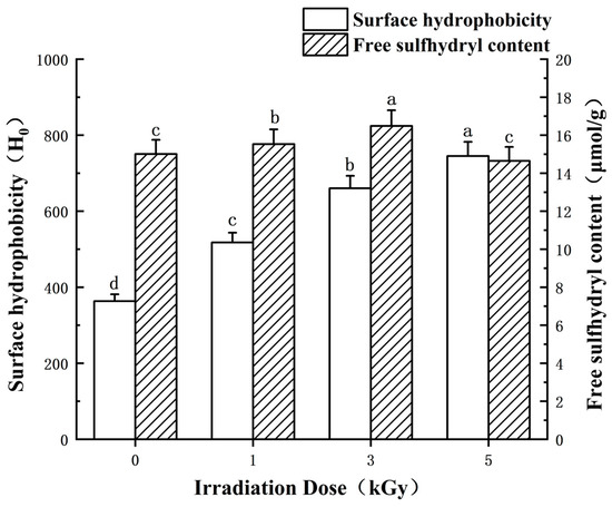 The alteration in free sulfhydryl (SH group) content and the surface hydrophobicity of LEW following irradiation treatment is illustrated in Figure 1. The free SH groups of LEWPs gradually increased and reached a maximum value (~16 μmol/g) at a dose of 3 kGy. As the irradiation dose increased, a significant rise in the surface hydrophobicity of the LEW samples was observed (p < 0.05). The irradiation process enhanced the hydrophobicity of proteins by exposing non-polar groups, such as an increase in sulfhydryl content, thereby favoring protein proximity and aggregation tendency [24]. In a similar study, Liu et al. also noted a slight elevation in the surface hydrophobicity of ovalbumin compared to natural ovalbumin across varying irradiation doses [25]. It was also noteworthy that the content of free SH groups of LEW decreased at 5 kGy irradiation (p < 0.05) compared with the sample irradiated at 3 kGy but was identical to nonirradiated LEW (p > 0.05). This phenomenon implied the excessive loss of active SH during the irradiation-induced oxidation process [5,26]. Overall, these hydrophobic amino acid residues (e.g., Trp, Tyr, Met, Cys, Phe and Pro) tend to be exposed to a more polar environment following irradiation and may facilitate the spontaneous adsorption process of proteins. Indeed, an appropriately increased surface hydrophobicity could show an advantageous factor towards the desirable foaming capacity of proteins [27].