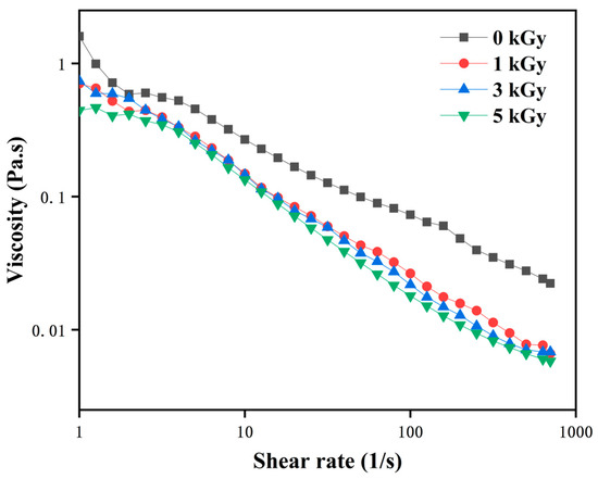 The rheological viscosity of LEW samples irradiated at different doses was measured using a rotational rheometer (DHR-2, Waters Corporation, Milford, MA, USA) by a steady shear test. Firstly, LEW samples were balanced at room temperature for 20 min. Then steady-state scanning was used with a conical plate (40 mm diameter, 0.052 mm gap). The experimental temperature was set at 25 °C, and the shear rate ranged from 1 s−1 to 700 s−1.