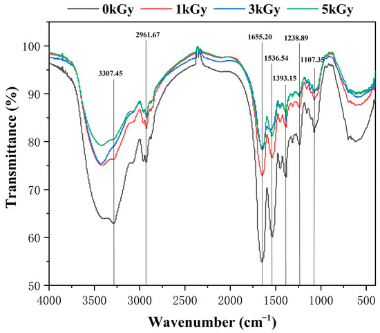 Xue et al. conducted a study that delved into the crystal structure of the LEW gel, where FT-IR spectroscopy was used to assess the compositional and conformational properties associated with the gel network [40]. In the literature, the peak observed at 2961 cm−1 corresponds to the stretching vibration of the CH3 and CH2 functional groups. Noteworthily, the absorption peaks of the protein encompass the amide I band (1600–1750 cm−1), amide II band (1575–1480 cm−1) and amide III (1400–1200 cm−1). Amide I vibration is contingent upon the secondary structure of the main chain. As depicted in Figure 5, the increase in the radiation dose induced significant alterations in the peak within the amide I region band (1655.2 cm−1), which indicated substantial changes in the secondary structure. Additionally, the peak at 1536.5 cm−1 (-CN vibration) tended to be compromised with increasing irradiation doses. Furthermore, the absorption peak of the nonirradiated sample (0 kGy) within the 3800–3100 cm−1 range, which corresponded to the stretching of the bound hydroxyl, is notably broader compared to that of LEW gel samples following irradiation. Generally, up to 5 kGy irradiation offered no significant alterations in the chemical composition of LEW gel samples.