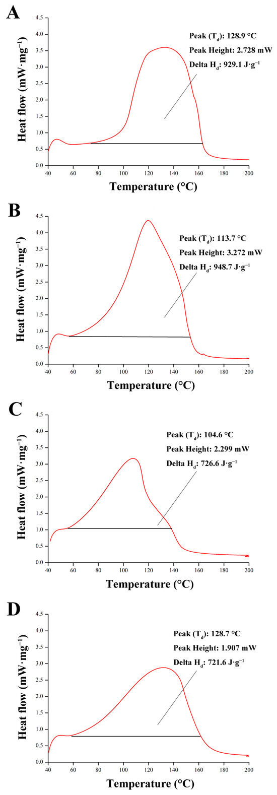 Comparative DSC spectra of LEW heat-set gels following different doses of irradiation ((A) 0 kGy, (B) 1 kGy, (C) 3 kGy and (D) 5 kGy).