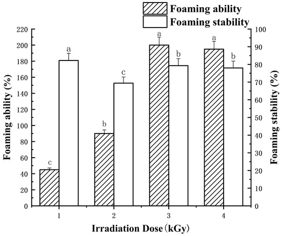 Effects of different irradiation doses (0–5 kGy) on foaming ability/stability of LEWPs. For each parameter, means denoted with different lowercase letters differed significantly (p < 0.05).