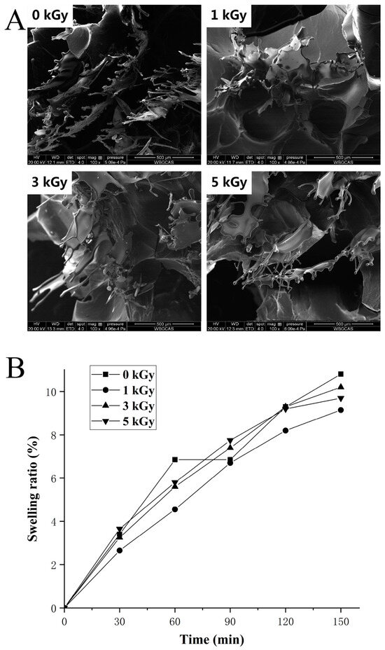 (A) SEM images (100× magnification) of LEW heat-set gels following different doses of irradiation (0–5 kGy). (B) Effect of different irradiation doses (0–5 kGy) on swelling degree of LEW heat-set gels subjected to enzyme-free simulated gastric juice.