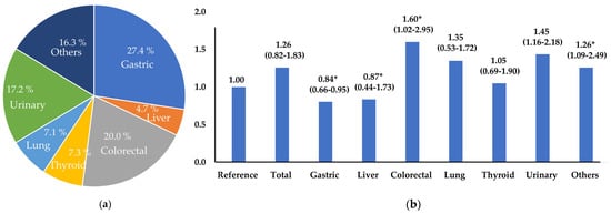 (a) Ratio of cancer type and (b) metabolic syndrome odds ratio of cancer type. * p < 0.05, significance level; Two cancer, 36 patients; Three cancer, 2 patients. Reference group: non–cancer with non–metabolic syndrome (1.00); Adjusted variables included age, income, smoking, and alcohol status.