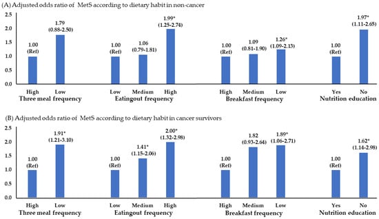 Consuming three meals did not impact the risk of MetS in non-cancer, but eating out frequently increased it by 1.99 times. There was a 1.26-fold increase in those who consumed breakfast infrequently. Among cancer survivors, eating less than three times per day saw the MetS prevalence increase by 1.9-fold, with a 2-fold increase observed with high eating out, and 1.89-fold in the breakfast skipping group. Further, a 1.6-fold increase in the MetS prevalence was observed in participants who did not receive nutritional education (Figure 2).