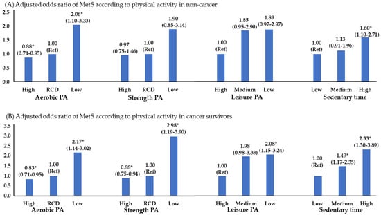 Deceased aerobic PA was higher by 2.06-fold and 2.17-fold in both non-cancer and cancer survivors below the recommended level, and strength exercise below the recommended level was higher by 2.98-fold only in the cancer-survivor group. It was 1.60 times in the non-cancer group with a sedentary lifestyle, and 2.33 times in the cancer-survivor group (Figure 3). Meanwhile, non-cancer individuals displayed no significant differences in strength exercise and leisure activities, while the cancer-survivor group exhibited significant values across all parts of physical activity.