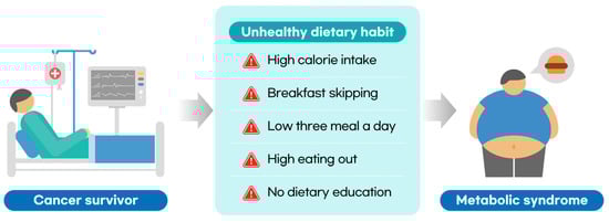 The mechanism underlying the development of MetS that occurs after cancer treatment may be related to a lack of physical activity and changes in dietary patterns as aftereffects of cancer treatment. Additionally, increased levels of stress hormones such as cortisol may negatively affect insulin sensitivity. Moreover, chemotherapy or hormone therapy may induce alterations in body composition, and there is a possibility of increased insulin resistance due to an increase in inflammatory cells [31,32]. By far, the most well-established approach is that dietary and lifestyle modifications are the most probable and effective methods for reducing the risk of MetS [33]. The development of MetS in survivors is undoubtedly influenced by physical activity and diet and requires close monitoring; hence, the habitual patterns in survivors need to be investigated.